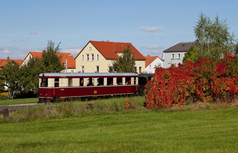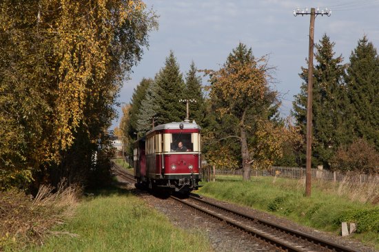 Ein schöner Herbstsonntag und der Zittauer Schmalspurtriebwagen VT 137 322 fährt ins Gebirge